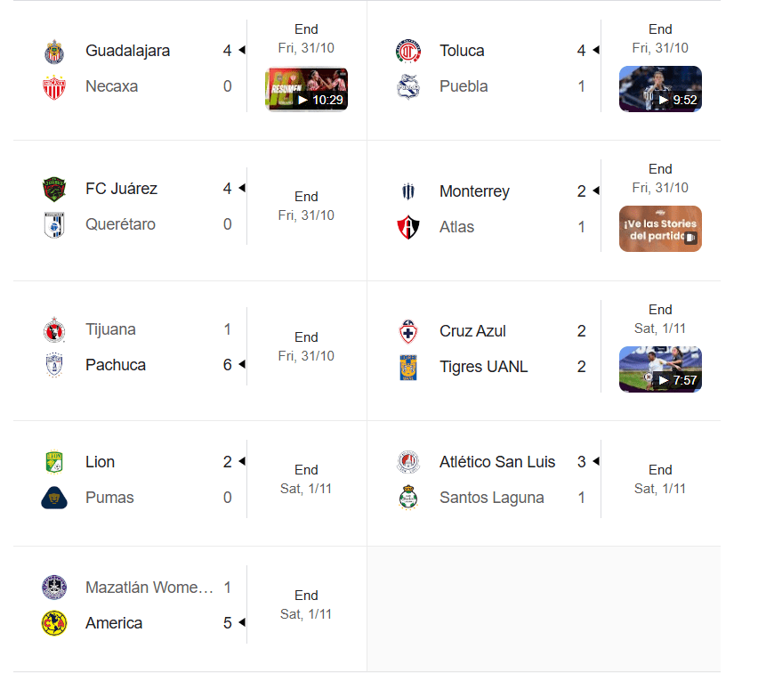 One of the highlights of the final games was the exciting 2-2 draw between Tigres UANL Femenil and Cruz Azul Femenil, in which Tigres fought back after falling behind early to secure their spot in first place. Toluca Femenil, meanwhile, defeated Puebla Femenil 4-1 to guarantee their home-leg advantage in the quarterfinals. Elsewhere, Club América Femenil made a strong statement as they prepare for the Liguilla by defeating Mazatlán Femenil 5-1 on the road. These games highlight the momentum that many of the teams headed to the playoffs are bringing into the elimination stage.