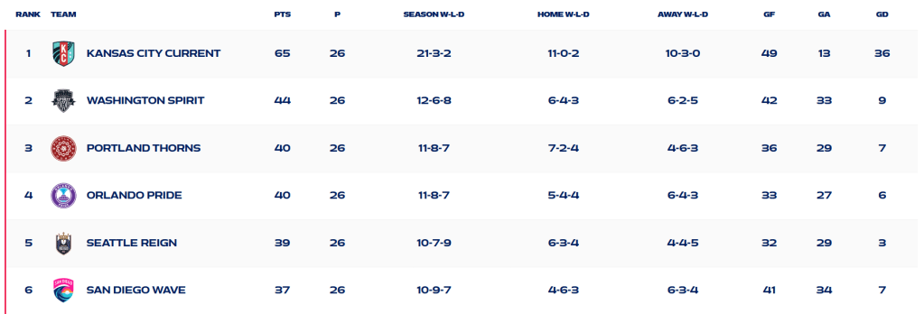 With a 2-1 victory over the San Diego Wave to secure the NWSL Shield and establish themselves as the team to beat, Kansas City Current concluded the season as the best team. The Portland Thorns took third place with a resounding 2-0 victory over the Houston Dash, while the Washington Spirit, who lost to the Utah Royals 1-0, were still in second place. Orlando Pride secured home advantage for their quarterfinal match after finishing fourth and drawing 1-1 with Seattle Reign FC.